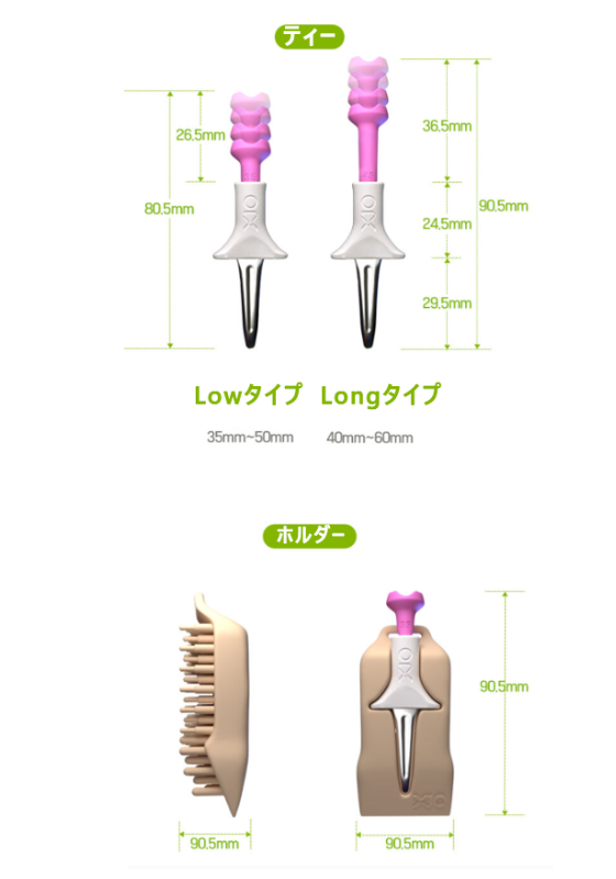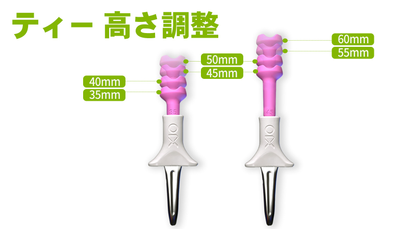 マルチゴルフティーは、使用シーンに合わせた高さを選べるよう、異なる2種類のティーを同梱。どちらもスイング時にしなやかに折れ曲がるため、ヘッドの軌道を妨げにくく、抵抗の少ない振り抜きを実現する設計となっている。