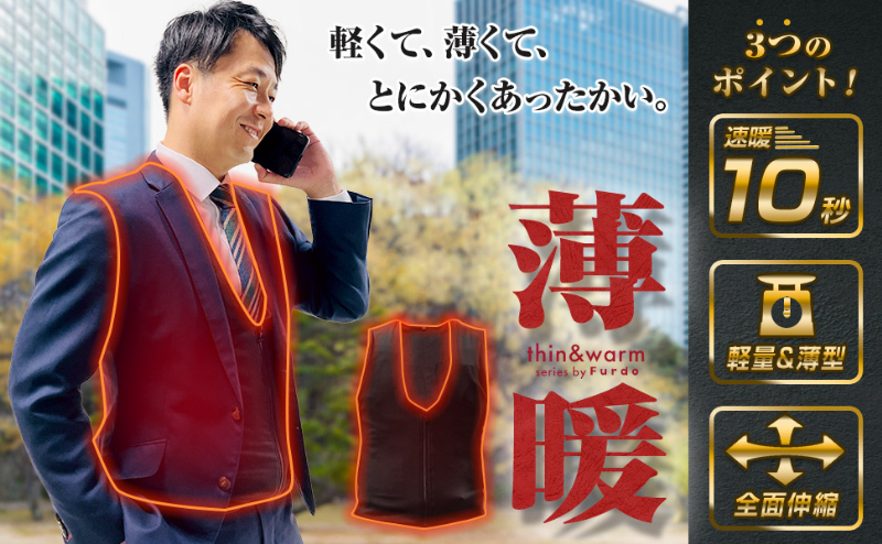 三金商事が展開するヒーターシリーズ「Furdo(フルドゥ)」から、電熱インナー「Furdo インナーヒーターベスト」が、楽天スーパーSALE期間中に特別価格で販売されている。テーマは「温泉のような心地よい温もり」。薄さ・軽さ・速暖性を追求したインナータイプの電熱ベストとして、冬ゴルフから日常使いまで幅広いシーンに対応する。