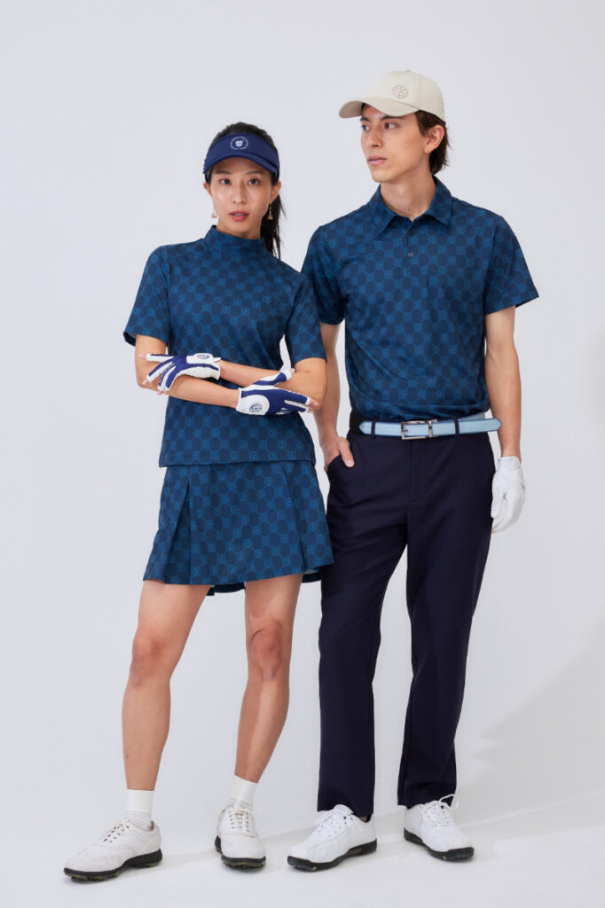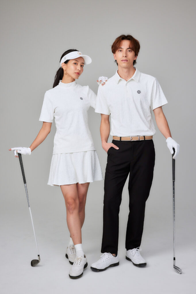 レディースで培った美意識をメンズへ: 「パートナーや家族と一緒にゴルフウェアを楽しみたい」という声を受け、今季からメンズラインを本格始動。レディースで培った「美しいシルエット」「心地よい素材選び」「カラーリングの楽しさ」をメンズにも反映し、カラーや素材感を揃えたペアコーディネートが楽しめるウェアも用意する。