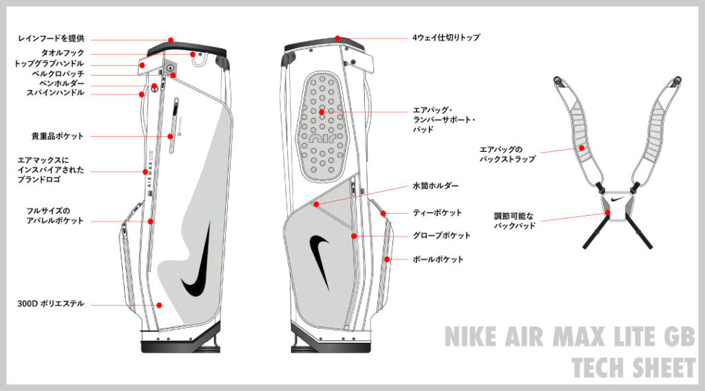NIKE AIR MAX LITE GBは、ナイキ独自の特許技術「エアバッグ・ランバーパッド」と「バックストラップサポート」を搭載。長時間のラウンドでも腰や肩への負担を軽減し、快適なプレーをサポートする。