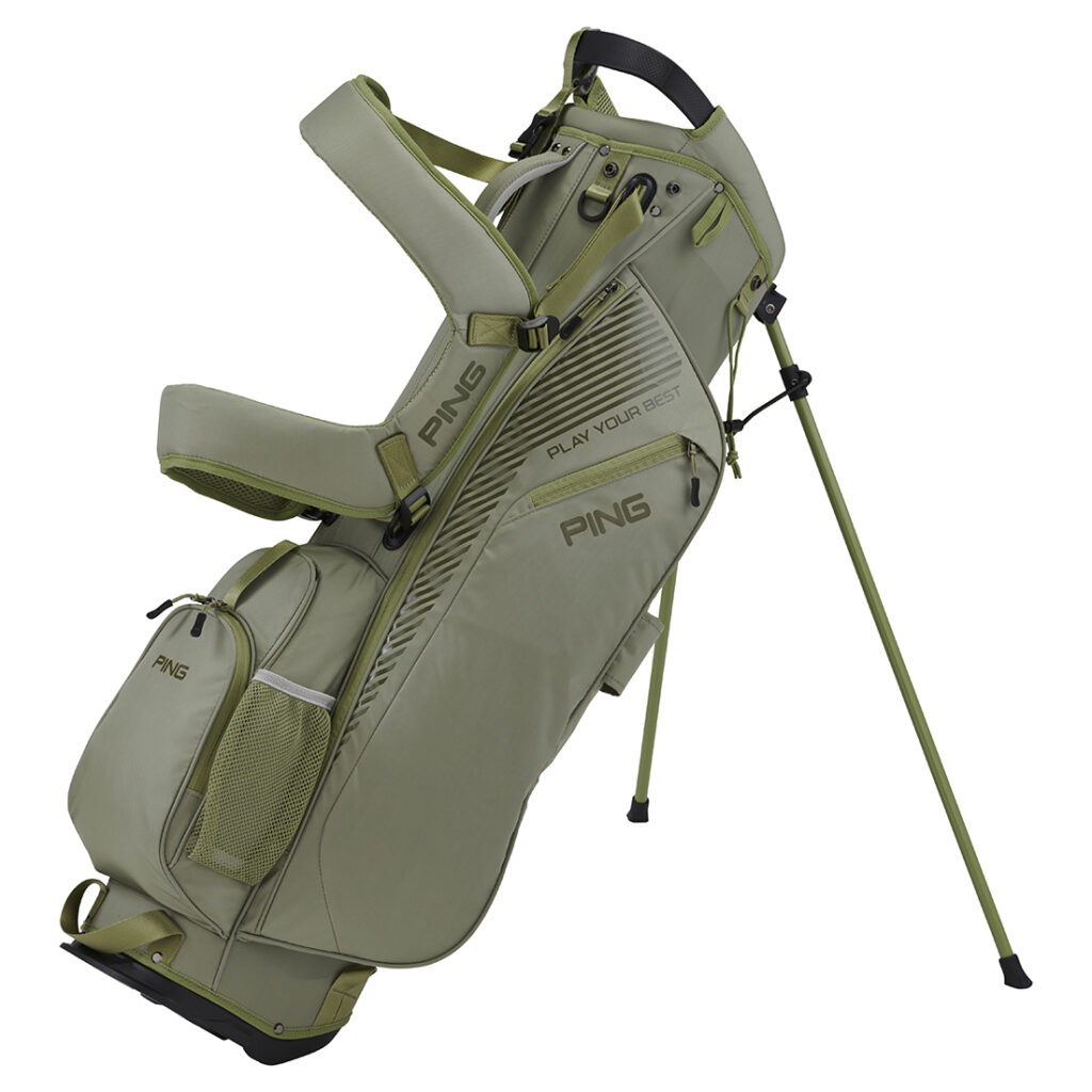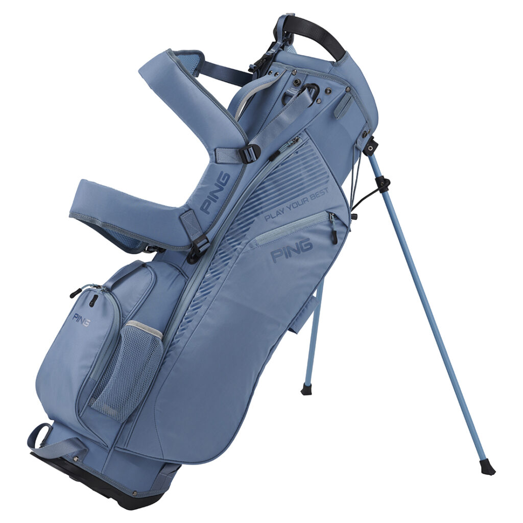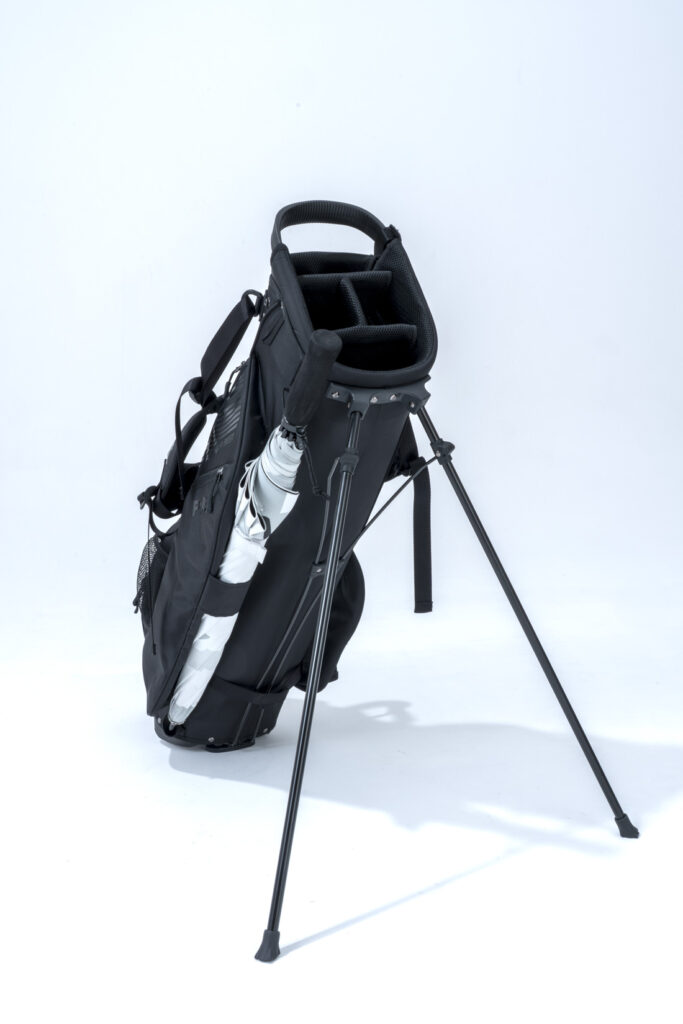 キャディバッグは、近年のゴルフスタイルに合わせ、電車移動や車での乗り合わせにも配慮した軽量かつコンパクトな仕様に設計した。8型口径ながら14本のクラブ収納に対応し、都市部の移動環境にもフィットする実用性を備えたスタンド式キャディバッグである。