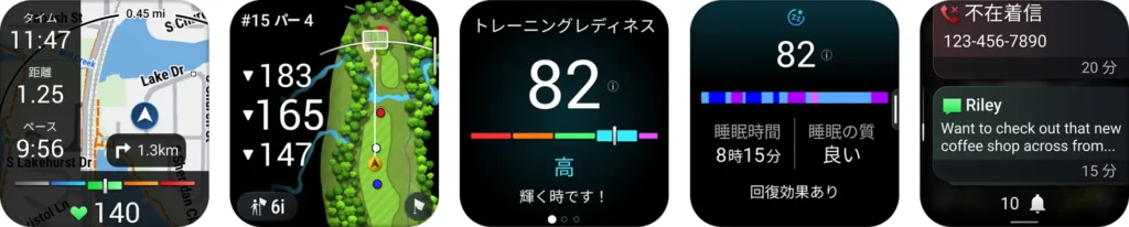左から、地図機能、ゴルフモード、トレーニングレディネス、睡眠スコア、通知機能
