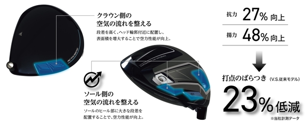 クラウン側の凸部に加え、ソール側にも大きな段差を設けた「New ActivWing」により、 ヘッドの空力性能がさらに進化。 ダウンスイング前半の「遠心力」によるヘッドのブレを抑制し、 芯を捉える安定したインパクトをサポートするとしている。