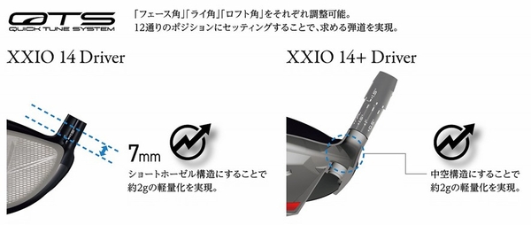 「ゼクシオ 14」「ゼクシオ 14+」ともに、ロフト角やライ角をすばやく変更できる 「QTS(クイックチューンシステム)」を搭載。 従来の構造から約2gの軽量化を実現し、重心設計の自由度を保ちながら、 求める弾道への調整を可能にした新設計としている。