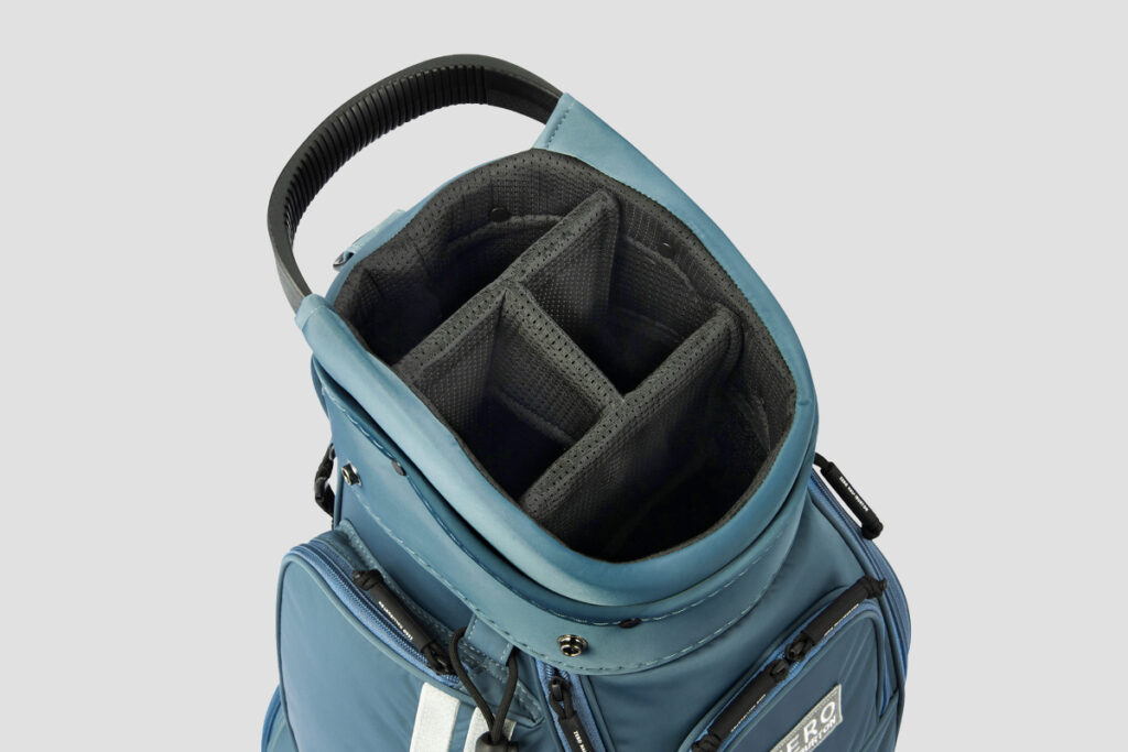 口径は8.5インチとコンパクトで、洗練されたシルエットが魅力。スタンドタイプには自立性の高い底面構造を採用し、マグネット式ポケットやボールポケット、大型サイドポケットなど、使いやすさを追求したディテールが光る。同素材のバッグやヘッドカバーも展開されており、統一感あるスタイルを楽しめる。