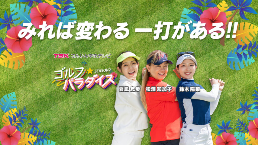 みれば変わる一打がある! ゴルフの魅力と上達のコツをたっぷりお届けするゴルフ情報満載の楽園「ゴル☆パラ」。ゴルファーの課題と向き合い、毎回テーマを設定。実践テクニックを交えながら徹底検証していく。ゴルフ界の元祖アイドル・松澤知加子プロのわかりやすいレッスンとゴルフ界で飛躍を誓う鈴木陽菜プロのテクニックは必見。100切りを目指すタレント・夏凪志歩の成長ぶりなど、初心者からアベレージゴルファーも楽しめるゴルフコンテンツだ。